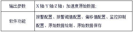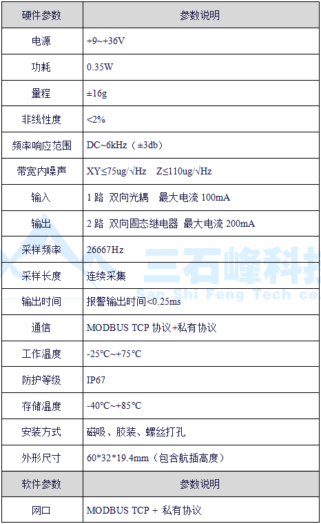 量程:±16g | 频响:DC~6kHz(±3db)| 采样率:26667Hz |采样长度:连续采集 输出时间:报警输出时间<0.25ms | 通讯协议:MODBUS TCP协议+私有协议|防护等级:IP67 |